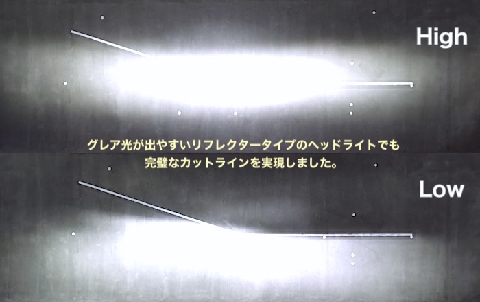 グレア光が出やすい、リフレクタータイプのヘッドライトでも、完璧なカットラインを実現しました。